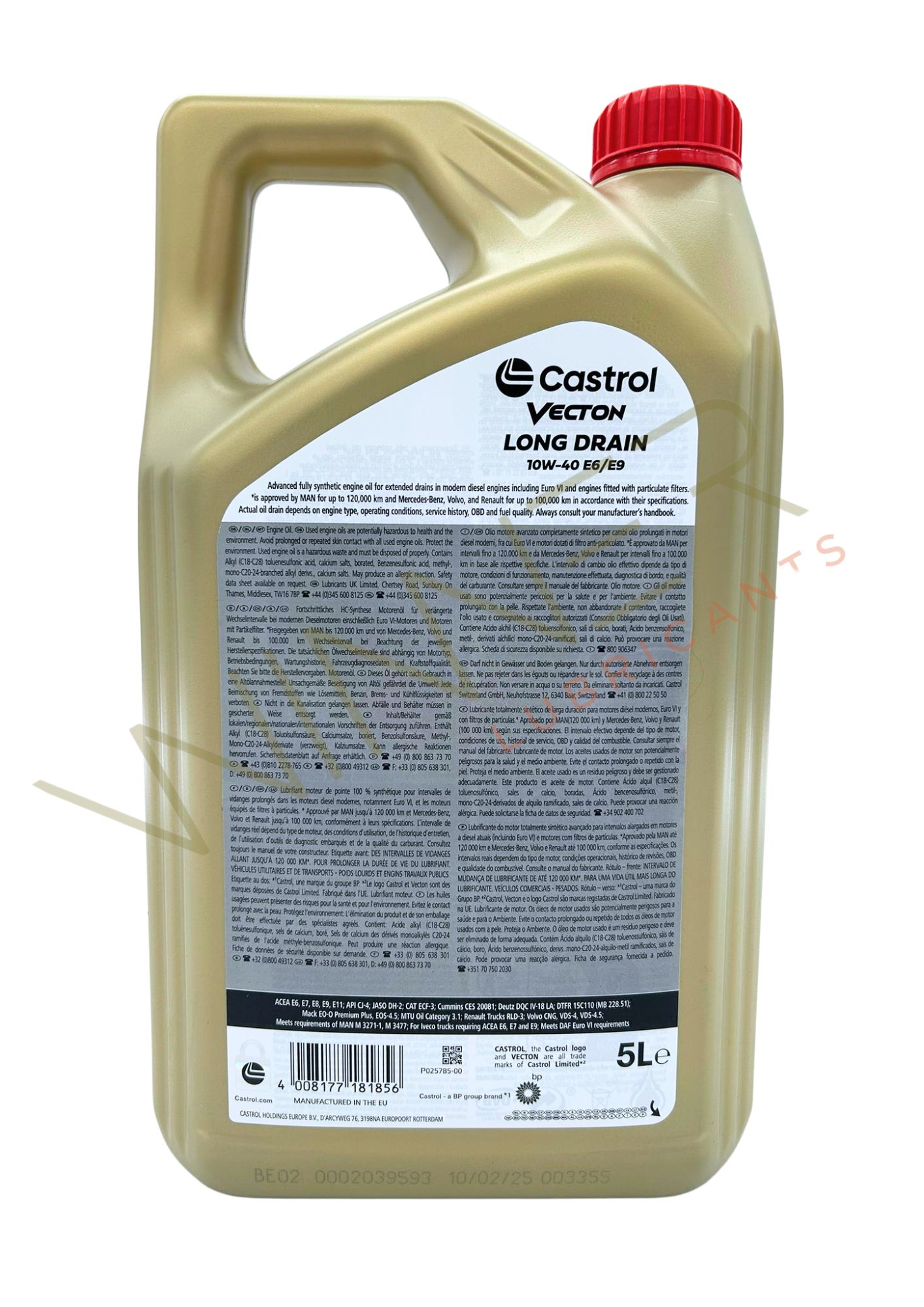 Castrol VECTON Long Drain 10W-40 E6/E9 è un lubrificante completamente sintetico, progettato per i motori diesel europei di ultima generazione (Euro I – Euro VI).